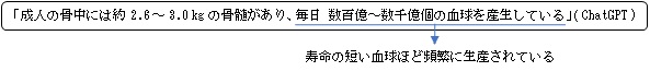 骨 髄( こつずい、英:bone marrow ) ・概 要 ・種 類 (赤色骨髄、黄色骨髄) ・構 成 ・イラスト掲載サイト 【概 要】 骨の空間 ⇒ 長骨における髄腔や扁平骨などの海綿質の骨梁の間隙 ・耳小骨 : ツチ骨、キヌタ骨、アブミ骨、非常に小さく骨密度が高い。 ・含気骨 : 蝶形骨や上顎骨などの空気を含む骨。空気を含むための空洞で占められる。 血球の種類 寿 命 1日あたりの産生量の目安 備 考 1 赤血球 約120日 約2~3兆個 寿命が長めなので1日の産生量は膨大だが、白血球より安定的 2 血小板 約7〜10日 約1兆個 寿命が短いため、毎日大量に補充される 3 好中球 数時間〜数日 約1000億個 寿命が非常に短いため、骨髄での産生は非常に活発 4 単球/リンパ球 数日〜数年 数億〜数十億個 種類によって寿命や産生頻度に差がある ■ 種 類 ■ 骨髄には、造血機能を営んで赤色を呈している赤色骨髄と、脂肪化して造血機能を停止し黄色を呈している黄色骨髄の2種類がある。 出生後の骨髄はほとんどが赤色骨髄だが、年齢を重ねるにつれて段々と黄色骨髄の割合が増えていく。 1 赤色骨髄 red (bone) marrow 造血機能を盛んに営んでいる骨髄で、胎児や新生児の骨髄はほとんどがこの赤色骨髄。しかし、加齢ととも少しずつ黄色骨髄に置き換わっていく。成人になっても赤色骨髄を有する骨は以下になり、椎骨を除いてはほとんどが扁平骨 体幹部)胸骨、脊椎、肋骨、寛骨 頭 部)頭頂骨、前頭骨、側頭骨、後頭骨 ※大腿骨や上腕骨などでも、近位端の骨端部など限られた場所には成人になっても赤色骨髄が存在する。 2 黄色骨髄 yellow (bone) marrow 赤色骨髄が脂肪化し、造血機能を停止してしまったもの。加齢とともに四肢の骨髄の造血機能がだんだん失われ黄色骨髄となっていく。 ■ 構 成 ■ ※一部、正確性に欠ける可能性有! 1 血液細胞 blood cell 造血幹細胞や分化過程中にある各種の細胞 2 間質細胞 stromal cell 間葉系由来の細胞で、骨細胞、軟骨細胞、脂肪細胞などさまざまな細胞に分化する。血液細胞を支持している。 3 脂 肪 fat 胎生期や乳児期にはほとんどこの脂肪は見られないが、成長するに従ってその割合は増えてくる。 【参考にしたサイト】 ・骨髄の細胞組織学的写真を掲載しているサイトⅠ(日本語の解説有) ・骨髄の細胞組織学的写真を掲載しているサイトⅡ ・骨髄の細胞組織学的写真を掲載しているサイトⅢ ・細胞組織学的解説動画(YouTube)Ⅰ ・細胞組織学的解説動画(YouTube)Ⅱ