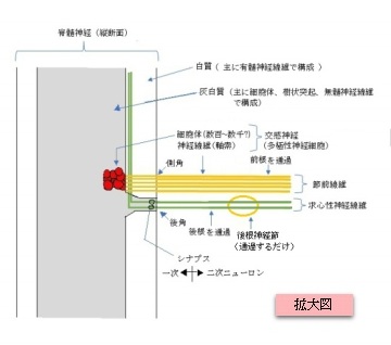 ・そして後角から脊髄に入った部位でシナプスをし、一次ニューロンとなって白質を上行する。