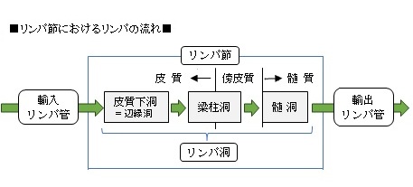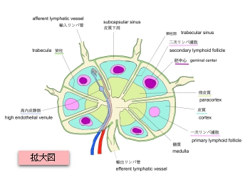 リンパ節は大きく最外側あたる被膜とその内部構造に分けることができる。そして内部構造はさらにいくつかの部位に分かれる。