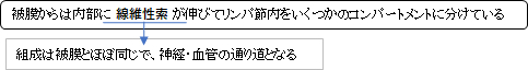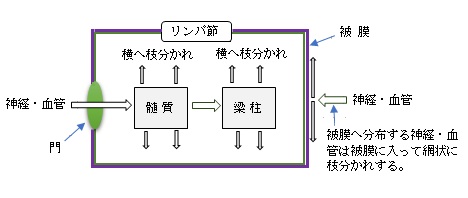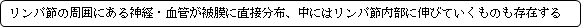 リンパ節の周りに存在する血管・神経が被膜に直接分布する。被膜に入ってからネットワークを築いて被膜全体を覆う形を取る。