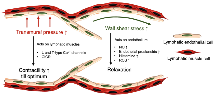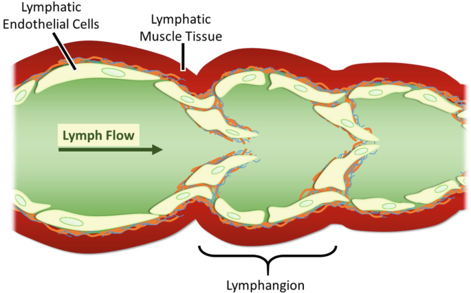 数層の平滑筋線維と少量の弾性線維。収縮によってリンパを送る。 |