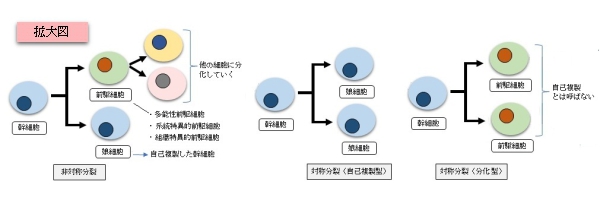 ・幹細胞が分裂して2つの細胞を作るとき、1つは元の幹細胞と同じ性質を保つ(幹細胞として残る)