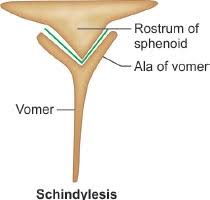 The broaden caudal extremity of the vomer spreads under the body of the presphenoid bone. It presents in its middle a groove that separates the two lateral extensions: the wings of the vomer (Alae vomeris). These extensions unite to the ethmoid, palatine and pterygoid bones.