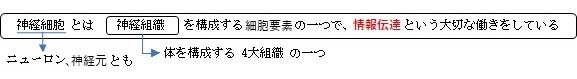 神経細胞( しんけいさいぼう、英:nervous cell, neuron ) ・概 要 ・構 成 ・分 類 ・参考となるサイト ■ 概 要 ■ ・神経組織を構成するもう一つの細胞成分は神経膠(細胞)となる。 ■ 構 成 ■ 神経細胞は、大きく細胞小器官(核、ミトコンドリアなど)を収めている細胞体と、そこから突き出ている突起とに分けることができる。 ■ 分 類 ■ ・形状による基本的な分類(「Wikipedia」の「neuron」を参考に作成) 細胞体からの突起の出方によって以下のように分類されている。 単極神経細胞 双極神経細胞 多極神経細胞 偽単極神経細胞 【参考になるサイト】 ・イラストや写真を掲載しているサイト-Ⅰ(多極ニューロンのイラスト) ・イラストや写真を掲載しているサイト-Ⅱ(4種類のニューロン) ・イラストや写真を掲載しているサイト-Ⅲ(多極ニューロンのイラスト) ・イラストや写真を掲載しているサイト-Ⅳ(細胞体の内部を描いたイラスト) ・イラストや写真を掲載しているサイト-Ⅴ(4種類のニューロン)