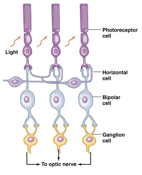 Horizontal cells are the laterallyinterconnecting neurons having cell bodies in the inner nuclear layer of the retina of vertebrate eyes. They help integrate and regulate the input from multiple photoreceptor cells. Among their functions, horizontal cells are believed to be responsible for increasing contrast via lateral inhibition and adapting both to bright and dimlight conditions. Horizontal cells provide inhibitory feedback to rod and cone photoreceptors. They are thought to be important for the antagonistic center-surround property of the receptive fields of many types of retinal ganglion cells.