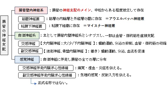 腸管壁内神経系は高度に自律した腸管独自の神経系で、中枢から完全に切り離されてもある程度機能することができる。また、外部神経からの枝の入力も受け、腸管内の筋の運動や分泌活動の調節に関与して初めて腸管が本来持つ機能が正しく作用する。
