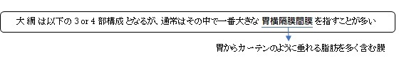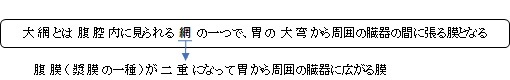 1. 胃を覆う臓側腹膜が大弯から二重になり、脂肪組織、神経、血管、リンパ管などを含んで下に垂れていく。