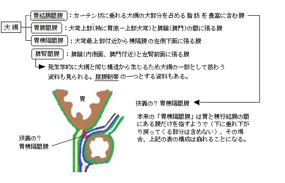 ・ phrenosplenic ligament : 横隔脾ひだ ・ distinction : 区別、特徴 ・ nebulous : 不明瞭な ・ gastroepiploic arteries : 胃大網動脈 ・ celiac trunk : 腹腔動脈 ・ gastroduodenal artery : 胃十二指腸動脈 ・ common hepatic artery : 総肝動脈 ・ splenic artery : 脾動脈 ・ anastomose : 吻合する