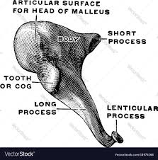 The incus is the second of the ossicles, three bones in the middle ear which act to transmit sound. It is shaped like an anvil, and has a long and short crus extending from the body, which articulates with the malleus.: 862 The short crus attaches to the posterior ligament of the incus. The long crus articulates with the stirrup at the lenticular process.