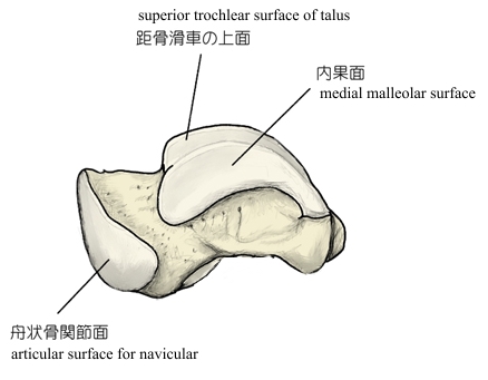 | か行 | ・ 外果面 ・ 外側結節 ・ 距骨外側突起 ・ 距骨滑車 ・ 距骨滑車上面 ・ 距骨頚 ・ 距骨溝 ・ 距骨後突起 ・ 距骨体 ・ 距骨頭 ・ 後踵骨関節面 |