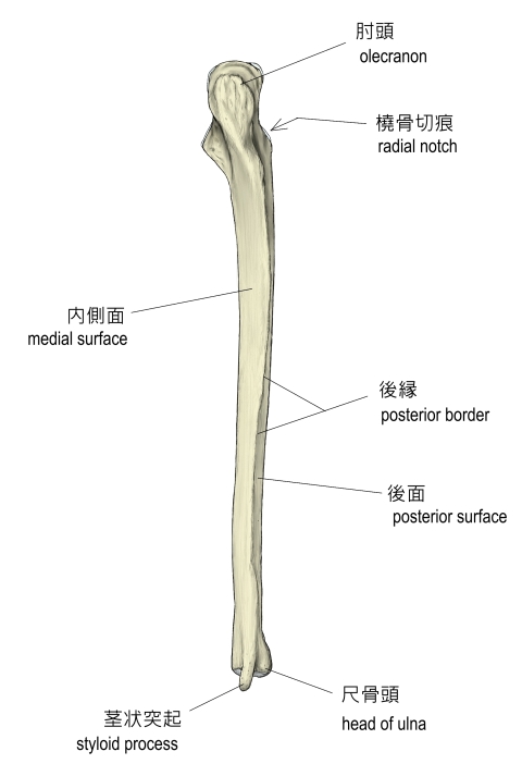 「上下の両端と体が区分される。この骨は橈骨とは逆に上端部が大きく下端部が細い。 」「船戸和弥のホームページ」