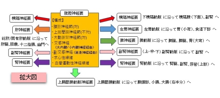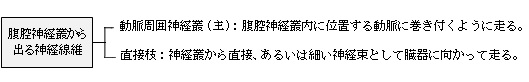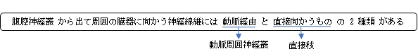 腹腔神経叢から動脈を介さず周囲の臓器に向かう神経線維は、神経叢を形成せず比較的独立した神経束として走ることが多い。