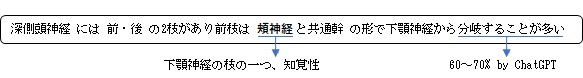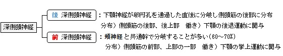 以下は「Wikipedia」の解説文となる。 「The deep temporal nerves, branches of the mandibular division of the trigeminal nerve, are two in number, anterior and posterior.[1] They pass above the upper border of the pterygoideus externus and enter the deep surface of the temporalis.