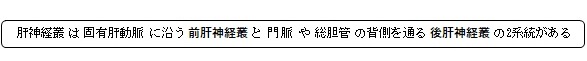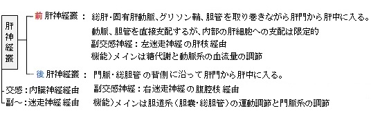 「肝神経叢は特に迷走神経の後幹Truncus dorsalis n. vagiと腹腔神経叢とから出る枝によってつくられる.太くて平たい神経索が目の細かい網の形をなして肝動脈と総胆管,総肝管および胆嚢管を取りまき,細い枝が門脈にも達している.この神経叢の中には顕微鏡的な小さい神経節と散在性の少数の神経細胞とがある.総肝管の諸枝および固有肝動脈の諸枝に伴なって数多くの細い核が肝臓の内部に入る.これらの枝は大部分が無髄線維よりなっている.肝神経叢から分れて出る枝は胃十二指腸動脈に伴なって胃の大臀および膵臓に達する.(以前には胃十二指腸動脈に伴なう神経叢をPlexus gastricus inferior(下胃神経叢)と呼んだ.)」