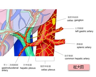 ・神経叢から出る枝の中には胃十二指腸動脈に伴なって胃の大臀および膵臓に達する.