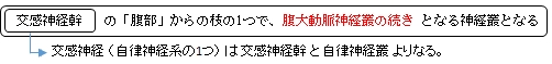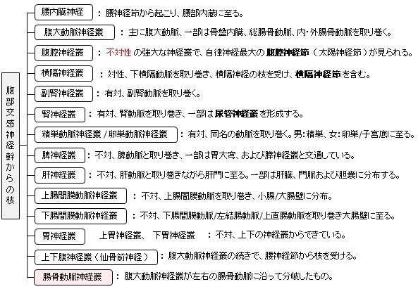 腸骨動脈神経叢 ( 交感神経幹からの枝 ) (ちょうこつどうみゃくしんけいそう 、英 :iliac plexus ) 腸骨動脈神経叢とは ■ 骨盤内臓に分布 ■ 一部は、腹膜の直下を直腸の両側に沿って下行し、骨盤内臓に分布する。 ■ 腸骨動脈とともに下行 ■ 一部は総腸骨動脈、内・外腸骨動脈を取り巻きながら下行し、大腿動脈神経叢/膝窩動脈神経叢と連絡する。 「 日本人体解剖学 (上巻)」では以下のように解説している。 「腹大動脈神経叢は骨盤部に至り、左・右の総腸骨動脈に沿って分岐し腸骨動脈神経叢となり、一部は腹膜のすぐ下を直腸の両側に沿って下行し、骨盤内臓に分布するほか、一部は総腸骨動脈、内・外腸骨動脈を取り巻き下行し、大腿動脈神経叢および膝窩動脈神経叢に連絡する。 」 以下は「Wikipedia」の解説文となる。 「The iliac plexus is a twin nerve plexus covering the Common iliac arteries. The iliac plexus originates from the aortic bifurcation developing from the abdominal aortic plexus.[1] The superior hypogastric plexus is also a continuation of the abdominal aortic plexus.」 【 語 句 】 ・ Common iliac arteries : 総腸骨動脈 ・ aortic bifurcation : 大動脈分岐部 ・ abdominal aortic plexus : 腹大動脈神経叢 ・ superior hypogastric plexus : 上下腹神経叢 以下は交感神経の腹部からの枝を簡単に表した図となる。 【参考になるサイト】 ・イラストや写真を掲載しているサイト-Ⅰ ・イラストや写真を掲載しているサイト-Ⅱ