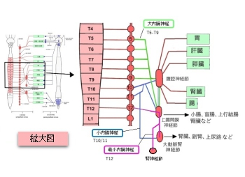 小内臓神経(交感神経)( しょうないぞうしんけい、英:lesser splanchnic nerve ) ・概 要 ・走 行 ・参考となるサイト(日本人体解剖学、イラスト掲載サイト) 【概 要】 【走 行】 1. 第10・11 胸神経節から出る交感神経線維が合する。 ( この場合の交感神経線維は有髄性の節前線維(多極神経細胞) (「ChatGPT」によれば合した神経線維には内臓からくる感覚線維も見られるようだ。) 2. 合した神経線維は後縦隔を下行し、横隔膜腰椎部で中間脚と内側脚の間を通って腹腔内に入る。 (背側では椎体に沿って走行し、胸大動脈や奇静脈系の近くを通る。) (「通過点は、大内臓神経と類似するが、小内臓神経は少し下の高さを通る。(ChatGPT)」 3. 腹腔内に入った後は腹膜神経叢に合流し、おもに 上腸間膜神経節、さらに 大動脈腎神経節 に至ってシナプス結合する。 4. 神経節でシナプス結合し、節後線維となって腸や腎臓などの臓器へ分布する。 ・「 腎枝は、また最下内臓神経として交感神経幹から直接起始することがある。」(日本人体解剖学 (上巻)) 以下は胸部の交感神経幹からの枝を簡単に表した図となる。 【参考となるサイト】 「 日本人体解剖学 (上巻) 」では以下のように解説している。 「第10~第12胸神経節から起こり、胸椎の側面を走って前記の大内臓神経とともに、あるいはその少し外側で横隔膜を貫いて腹腔内に入り、一部は腹腔神経叢に達し、一部は腎枝として腎動脈を取り巻く腎神経叢に入る。腎枝は、また最下内臓神経として交感神経幹から直接起始することがある。 」 交感神経(胸部)・模型図 【参考になるサイト】 ・イラストや写真を掲載しているサイト-Ⅰ ・イラストや写真を掲載しているサイト-Ⅱ ・イラストや写真を掲載しているサイト-Ⅲ ・イラストや写真を掲載しているサイト-Ⅳ ・イラストや写真を掲載しているサイト-Ⅴ