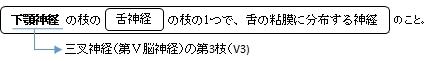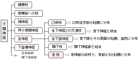 舌枝(舌神経)とは 「日本人体解剖学 (上巻) 」には以下のような解説が見られる。 「10本ほどの舌神経の終枝で、舌の前2/3の粘膜に至り、一般知覚と味覚をつかさどる。」 以下は三叉神経の枝を表した簡単な図となる。