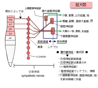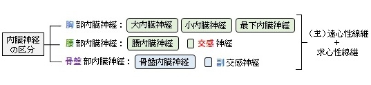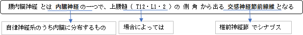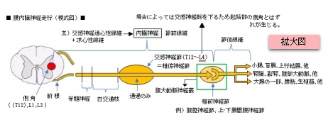 腰内臓神経(交感神経幹からの枝)( ようないぞうしんけい、英:lumbar splanchnic nerve ) 以下は交感神経の腹部からの枝を簡単に表した図となる。 腰内臓神経は内臓神経の一つであると同時に、腹部交感神経幹からの枝の一つでもある。 【参考になるサイト】 ・イラストや写真を掲載しているサイト-Ⅰ ・イラストや写真を掲載しているサイト-Ⅱ ・イラストや写真を掲載しているサイト-Ⅲ ・イラストや写真を掲載しているサイト-Ⅳ ・イラストや写真を掲載しているサイト-Ⅴ