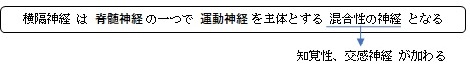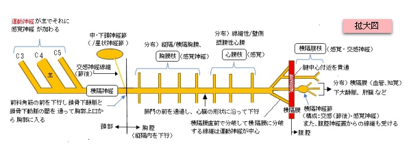 横隔神経は混合神経だが主は運動神経で、縦隔を下行し横隔膜に到達後、扇状に分岐して筋線維に分布。その走行の際に以下の枝(感覚神経、交感神経)を出す。
