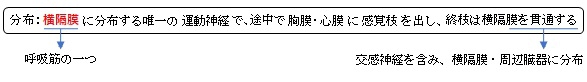 (下行中、多くの細かな枝(胸膜枝・心膜枝)を出し、胸膜、心膜、および横隔膜中央部の知覚を司る。)