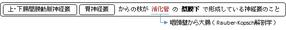 漿膜下神経叢 ( しょうまくかしんけいそう、英 : subserous plexus ) 漿膜下神経叢とは 「 日本人体解剖学 (上巻) 」には以下のような解説文が見られる。 「上・下腸間膜動脈神経叢および胃神経叢から出る枝は、胃・腸壁に穿入して腸筋神経叢をつくる。すなわち、腸壁における内・外筋層間で大きな神経細胞を含む筋層間神経叢(Auerbachの神経叢)をつくり、さらに内方に進んで粘膜下層で粘膜下神経叢(Meissnerの神経叢)をつくる。筋層間神経叢の発育は著しいが、粘膜下神経叢は薄弱である。なお、漿膜下には漿膜下神経叢が見られる。」
