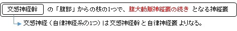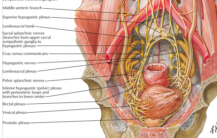 From the plexus, sympathetic fibers are carried into the pelvis as two main trunks- the right and left hypogastric nerves- each lying medial to the internal iliac arteryand its branches. The right and left hypogastric nerves continues as Inferior hypogastric plexus; these hypogastric nerves send sympathetic fibers to the ovarian and ureteric plexi, which originate within the renal and abdominal aortic sympathetic plexi. The superior hypogastric plexus receives contributions from the two lower lumbar splanchnic nerves (L3-L4), which are branches of the chain ganglia. They also contain parasympathetic fibers which arise from pelvic splanchnic nerve (S2-S4) and ascend from Inferior hypogastric plexus; it is more usual for these parasympathetic fibers to ascend to the left-handed side of the superior hypogastric plexus and cross the branches of the sigmoid and left colic vessel branches, as these parasympathetic branches are distributed along the branches of theinferior mesenteric artery.」