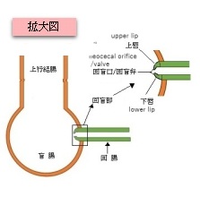 回盲部:基本的には盲腸壁の中に位置するので(一部内腔に突出する部分も見られる)