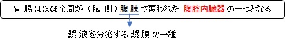 以下は「日本人体解剖学」の解説文となる。 盲腸が正常位よりも左方に偏し、ときに正中線あるいはそれを超えることがあり、また同時にやや下方に達することは約18%といわれ、盲腸が上方かつ右方に偏移することは約12%といわれる(移動盲腸 cecum mobile)