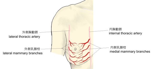 「 外側胸動脈は小胸筋の下縁に沿って胸壁外側面を下行し、胸筋、前鋸筋、肩甲下筋へ。多くは肩甲下動脈の枝と吻合し、また非常にしばしばこの動脈から分岐する。女性では外側乳腺枝を分枝し、これは大胸筋の下縁をまわって乳腺へ分布する。 」