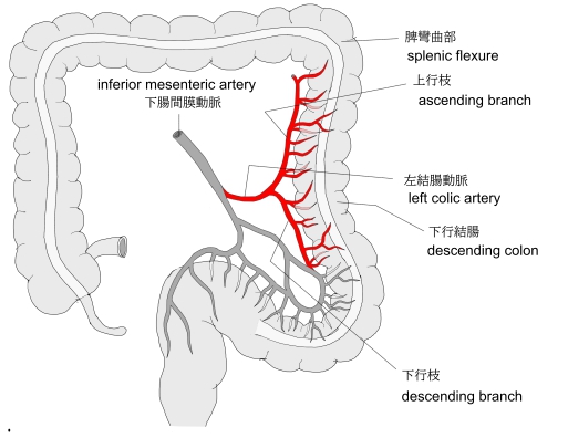 From the arches formed by these anastomoses branches are distributed to the descending colon and the left part of the transverse colon.」