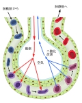 ・ pulmonary circulation : 肺循環 ・ deoxygenated : 脱酸素化した ・ pulmonary trunk : 肺動脈幹 ・ arterioles (arterioleの複数): 小動脈 ・ capillaries (capillaryの複数): 毛細血管 ・ pulmonary alveoli : 肺胞