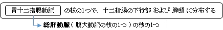 以下は胃十二指腸動脈の枝を簡単に表したものだが、「 日本人体解剖学 」では胃十二指腸動脈の枝として十二指腸上動脈(Wikipediaでは総肝動脈の枝としている)の名称は見られない。