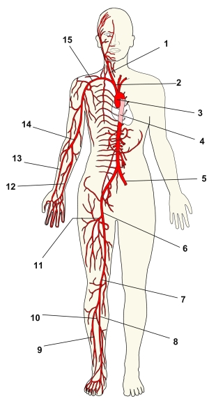 全身(前面) 1 総頚動脈 詳細 2 腕頭動脈 詳細 3 上行大動脈 詳細 4 下行大動脈 詳細 5 総腸骨動脈 詳細 6 大腿動脈 詳細 7 膝窩動脈 詳細 8 前脛骨動脈 詳細 9 腓骨動脈 詳細 10 後脛骨動脈 詳細 11 大腿深動脈 詳細 12 尺骨動脈 詳細 13 橈骨動脈 詳細 14 上腕動脈 詳細 15 右鎖骨下動脈 詳細 ⇒ 名称付きイラスト 【関連イラスト】