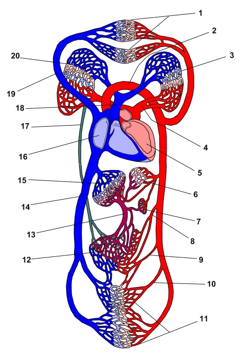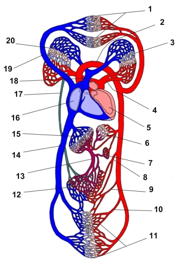 循環器系 1 上半身(の動脈) 2 大動脈弓 詳細 3 左肺 4 左肺静脈 詳細 5 左心室 6 胃 7 脾臓 詳細 8 上腸間膜動脈 詳細 9 下腸間膜動脈 詳細 10 内腸骨動脈 詳細 11 下半身(の動脈) 12 腸 13 門脈 詳細 14 下大静脈 詳細 15 肝臓 16 右心房 17 胸管 18 肺動脈 詳細 19 上大静脈 詳細 20 右肺 ⇒ 名称付きイラスト 【関連イラスト】