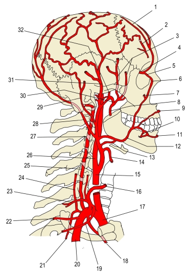 頸・頭部(右側面)Ⅰ 1 中前頭動脈 2 外側前頭動脈 3 (前・後)深側頭動脈 詳細 4 眼動脈 詳細 5 眼角動脈 詳細 6 鼻背動脈 詳細 7 眼窩下動脈 詳細 8 下歯槽動脈 詳細 9 上唇動脈 詳細 10 オトガイ動脈 詳細 11 下唇動脈 詳細 12 顔面動脈 詳細 13 舌動脈 詳細 14 上甲状腺動脈 詳細 15 総頚動脈 詳細 16 下甲状腺動脈 詳細 17 腕頭動脈 詳細 ⇒ 名称付きイラスト 【関連イラスト】