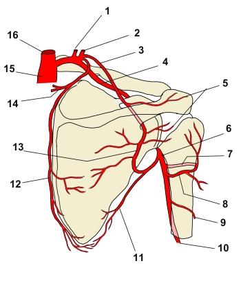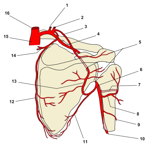 肩甲骨(背面) 1 椎骨動脈 詳細 2 甲状頚動脈 詳細 3 肩甲上動脈 詳細 4 鎖骨下動脈 詳細 5 肩峰動脈網 6 腋窩動脈 詳細 7 前上腕回旋動脈 詳細 8 後上腕回旋動脈 詳細 9 上腕深動脈 詳細 10 上腕動脈 詳細 11 胸背動脈 詳細 12 肩甲背動脈 詳細 13 肩甲回旋動脈 詳細 14 頚横動脈 詳細 15 腕頭動脈 詳細 16 総頚動脈 詳細 ⇒ 名称付きイラスト 【関連イラスト】
