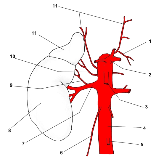 右腎臓周辺(前面) 1 上副腎動脈 詳細 2 腹腔動脈 詳細 3 上腸間膜動脈 詳細 4 腹大動脈 詳細 5 下腸間膜動脈 詳細 6 精巣動脈 (or卵巣動脈) 詳細 7 腎動脈 詳細 8 (右)腎臓 9 下副腎動脈 詳細 10 中副腎動脈 詳細 11 副腎(腎上体) 12 下横隔動脈 詳細 ⇒ 名称付きイラスト 【関連イラスト】