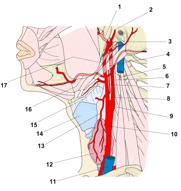 頚 部( 左側面 ) 1 顎動脈 詳細 2 浅側頭動脈 詳細 3 後耳介動脈 詳細 4 顎ニ腹筋(後腹) 詳細 5 後頭動脈 詳細 6 内頸動脈 詳細 7 上行咽頭動脈 詳細 8 外頚動脈 詳細 9 頚動脈洞 詳細 10 総頚動脈 詳細 11 内頸静脈 詳細 12 甲状腺 13 上甲状腺動脈 詳細 14 甲状軟骨 15 舌動脈 詳細 16 顔面動脈 詳細 17 茎突舌骨筋 詳細 ⇒ 名称付きイラスト 【 関連イラスト 】