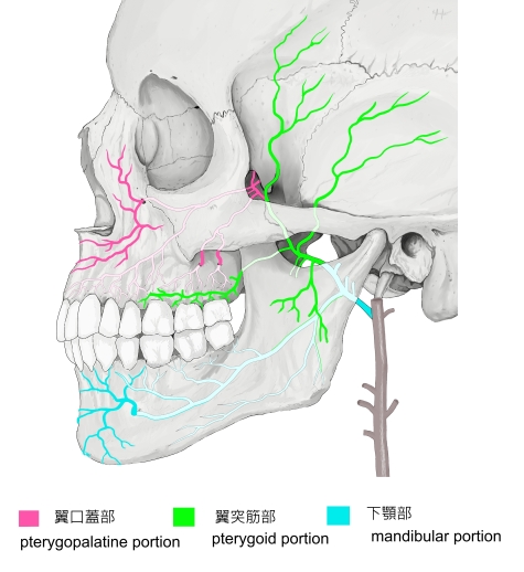 総頚・内頚・外頚動脈、 上甲状腺動脈、 舌動脈、 顔面動脈、 後頭動脈、 後耳介動脈、 浅側頭動脈