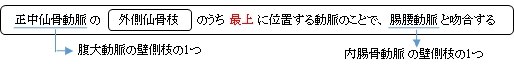 最下腰動脈 ( 正中仙骨動脈の枝 ) ( さいかようどうみゃく、英 :lowest lumbar arteries ) 最下腰動脈 とは ・「 5th lumbar artery 」という呼称を用いているサイトも見られる。「 船戸和弥のホームページ 」では以下のように解説している。 「 正中仙骨動脈からでる一対の側枝で第五腰動脈に相当 」 【 イラスト掲載サイト 】 ・ イラストや写真を掲載しているサイト-Ⅰ ・ イラストや写真を掲載しているサイト-Ⅱ ・ イラストや写真を掲載しているサイト-Ⅲ