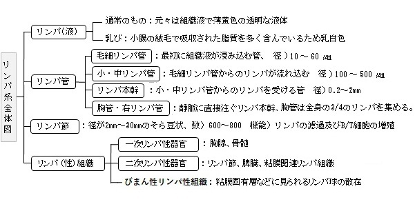 このリンパの流れる経路を「リンパ系」と呼び、以下のような構成要素が挙げられる。