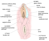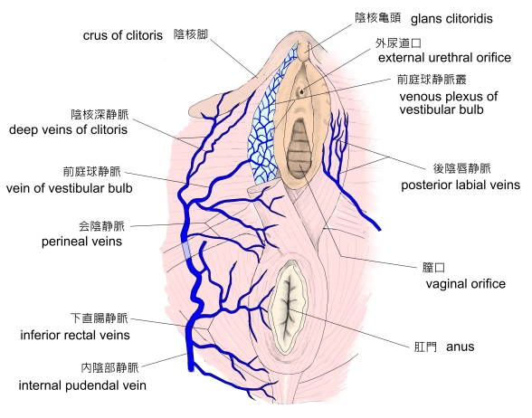 ・ pelvis : 骨盤 ・ venae comitantes : 伴行静脈 ・ internal pudendal artery : 内陰部動脈 ・ vulva : 外陰 ・ penis : 陰茎 ・ bulb of the vestibule : 前庭球 ・ bulb of the penis : 尿道球 ・ internal iliac vein : 内腸骨静脈 ・ urethral bulb : 尿道球 ・ perineal vein : 会陰静脈 ・ inferior hemorrhoidal vein : 下痔静脈 ・ deep dorsal vein of the penis : 陰茎深静脈 ・ pudendal plexus : 陰部静脈叢