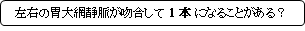 インターネットで画像検索をしてみると、左右の胃大網静脈を別々に描いているイラストよりは、左右の静脈が吻合して1本の静脈のように描いたイラストを掲載しているサイトのほうが多い。Wikipedia にはそのような解説は見られないので詳細は不明となる。いずれにしても、左右の胃大網静脈の血液の流れは異なり、右が右下方に流れて上腸間膜静脈に注ぐのに対して、左は左上方に走って脾静脈に注ぐ。
