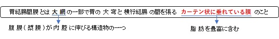 1. 胃を覆う臓側腹膜が大弯から二重になり、脂肪組織、神経、血管、リンパ管などを含んで下に垂れていく。