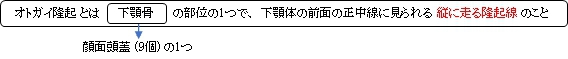 「前方正中線にある縦の隆起で、元来分離した下顎骨の両半分の癒合部に一致する。オトガイ隆起下端の両側には扁平な隆起があり、オトガイ結節という。オトガイ結節の外側上方で、第1(または第2)小臼歯の歯槽に一致したところに円い孔があり、これをオトガイ孔(オトガイ動・静脈、オトガイ神経が通る)という。オトガイ孔の後方から後上方に向かい、下顎枝前縁につづく軽度の隆起線を斜線という。 」