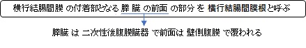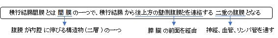 横行結腸間膜の基部は第2腰椎の前を横走する線上にあって、これを横行結腸間膜根という。横行結腸間膜は2層の癒着から成る。すなわち、後層は固有の結腸間膜であり、前層は大網後葉の連続であり、理論的には4枚の腹膜が区別される。