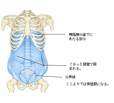 腹腔の上部は胸郭の下部で、また、下部は骨盤によってその形状が維持されているが、それ以外は主に筋肉によってその形状が維持されている。腹腔の境界部分を筋肉を中心に見ていくと