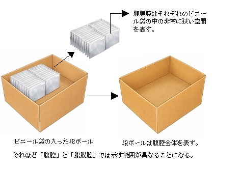 腹膜腔と同義で用いられるケースも往々にしてあるようだが、それぞれが指し示す場所は異なる。