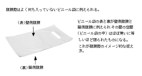 ・「臓側腹膜と壁側腹膜の間にはわずかな空隙があり、この空隙を腹膜腔という。」(日本人体解剖学)
